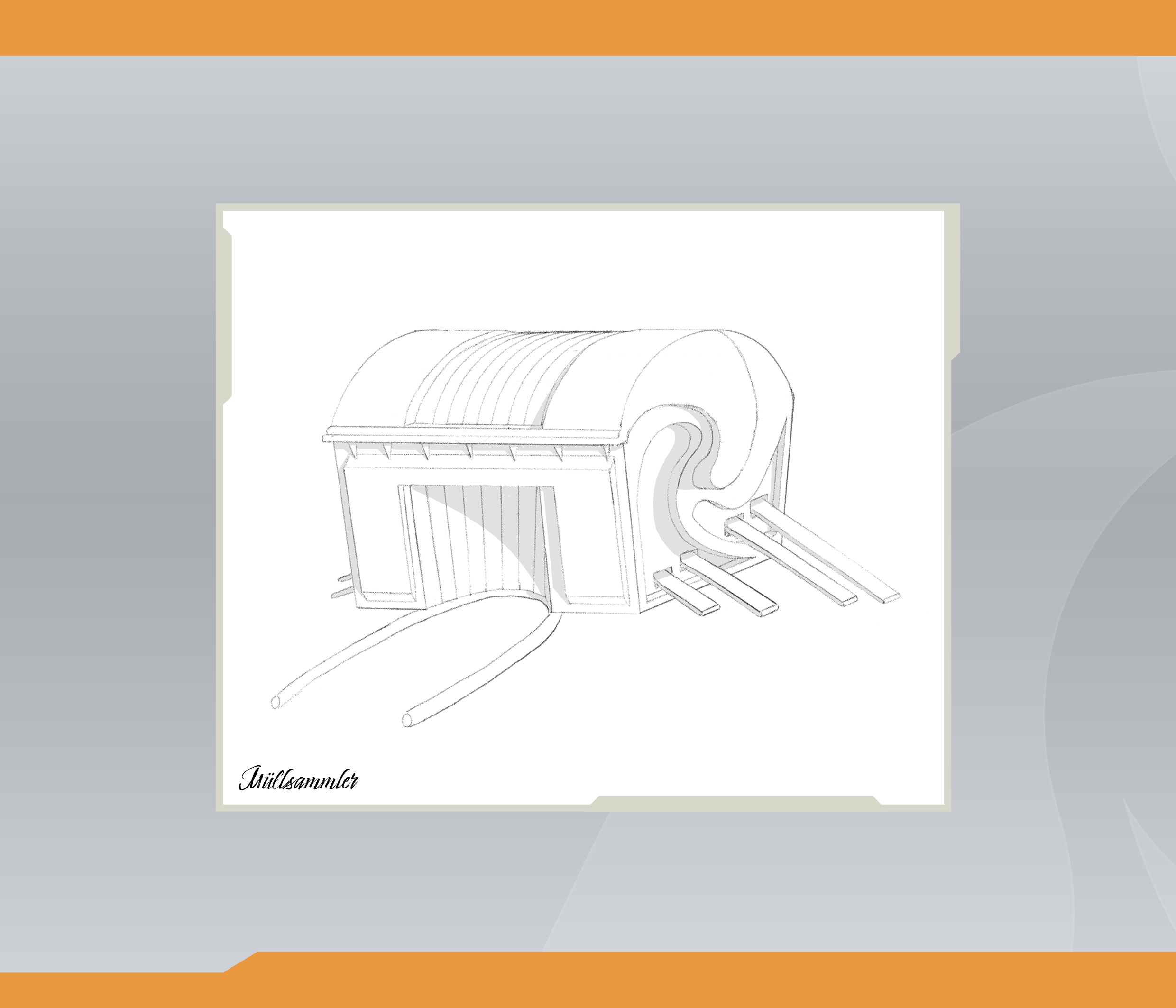 Ein Beispiel: der Müllsammler sieht von seinen Grundformen aus wie eine große Mülltonne. Ein Symbol dafür, dass dieses Gebäude den Müll aus dem Wasser extrahiert.