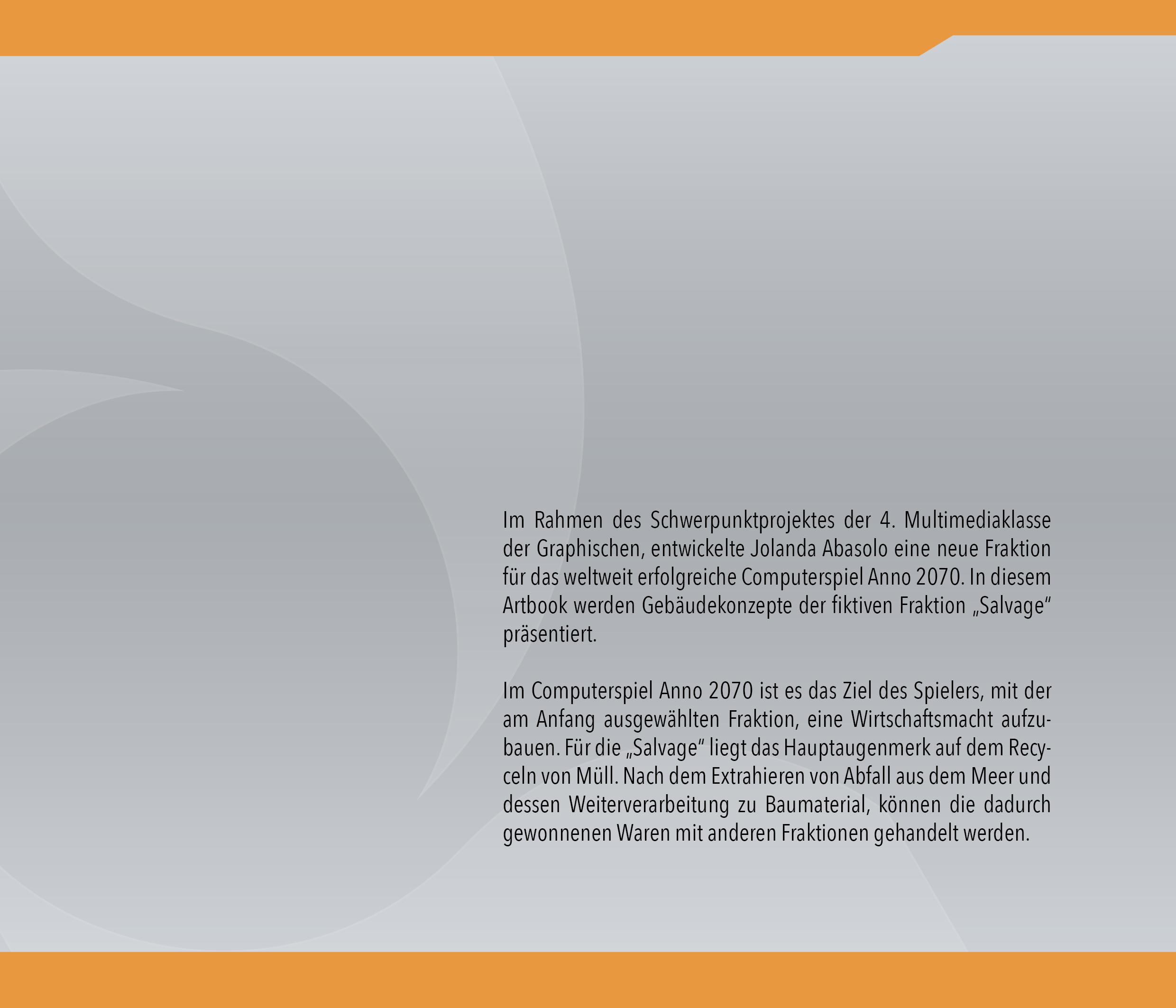 Im Rahmen des Schwerpunktprojektes der 4. Multimediaklasse der Graphischen, entwickelte ich eine neue Fraktion für das weltweit erfolgreiche Computerspiel Anno 2070. In diesem Artbook werden Gebäudekonzepte der fiktiven Fraktion „Salvage“ präsentiert.