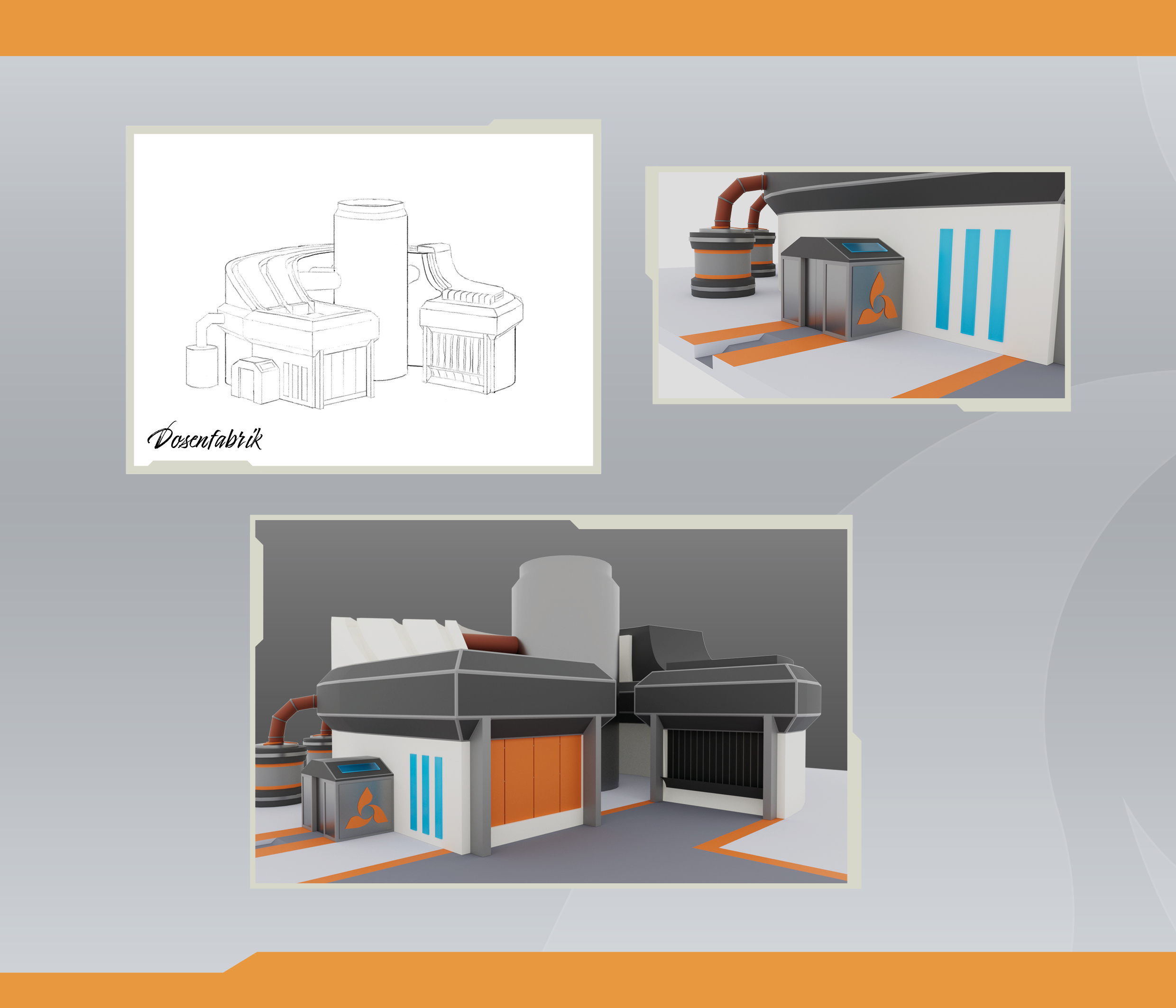 Die Skizzen wurden dann in Photoshop verfeinert und dann in Cinema4D 3D-modelliert. Die Dosenfabrik wurde zusätzlich in der Unreal Engine 5 fotorealistisch dargestellt. Abschließend wurden alle gerenderten Bilder in einem Artbook abgebildet. Das Design des Artbooks zitiert dass des Originals.